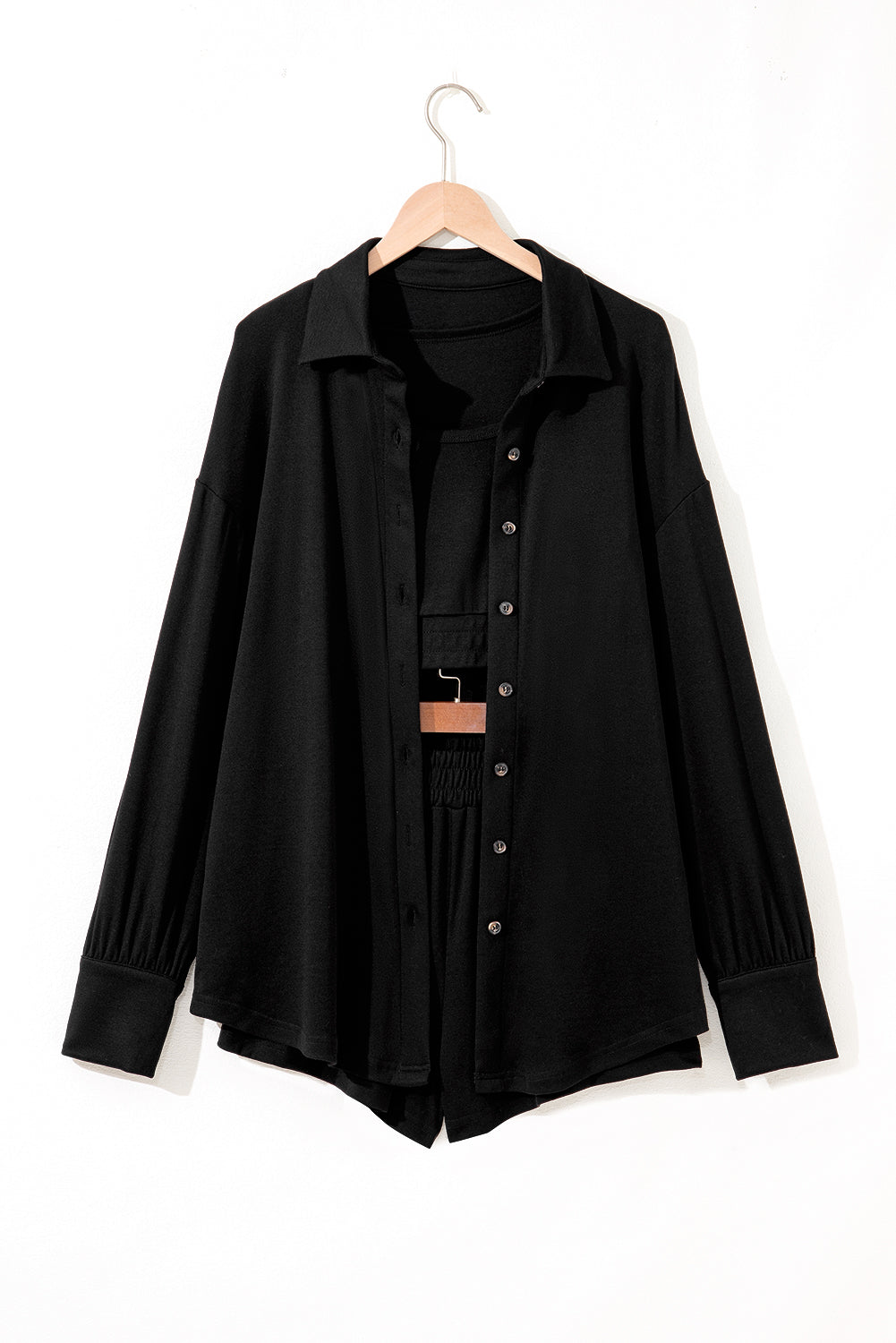 Black 3 Pcs Crop Tank Top Shorts with Cardigan Lounge Set