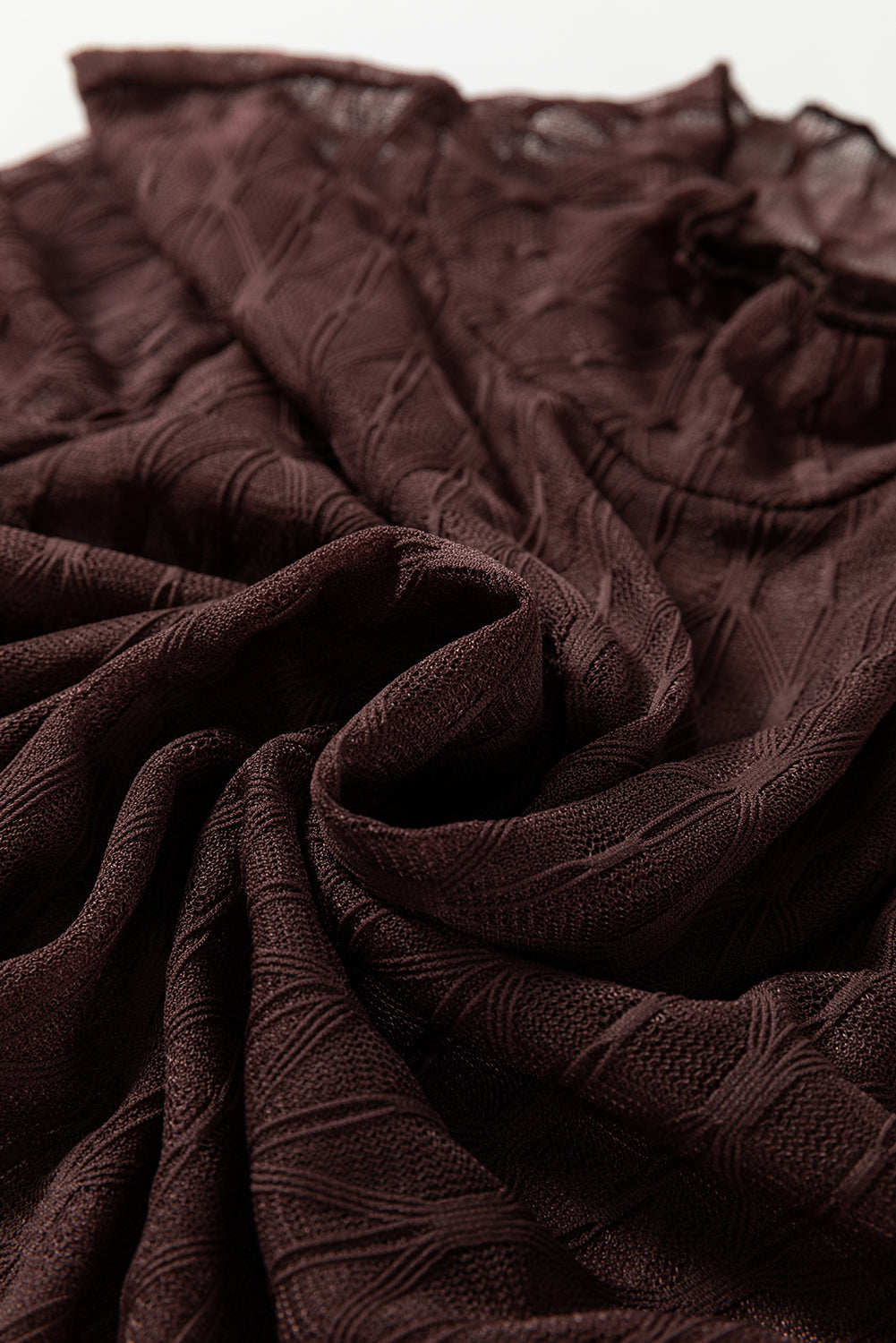 Coffee Sheer Mesh Patterned Lettuce Trim Slim Long Sleeve Top
